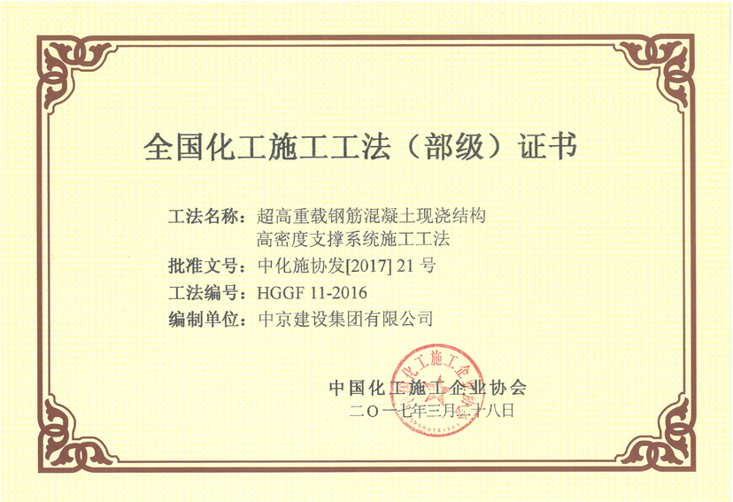 熱烈祝賀我集團(tuán)公司《燃煤鍋爐煙氣脫硝改造項(xiàng)目施工工法》、《超高重載鋼筋混凝土現(xiàn)澆結(jié)構(gòu)高密度支撐系統(tǒng)施工工法》成功申報部級工法,被中國化工施工企業(yè)協(xié)會正式授予“全國化工施工工法(部級)證書”。