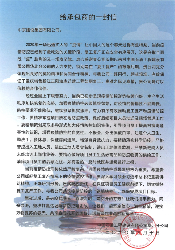 中國石油工程建設(shè)有限公司華北分公司對集團(tuán)公司的契約精神和協(xié)同合作精神給予了高度肯定和贊揚,集團(tuán)公司上下將繼續(xù)抓緊抓實抓細(xì)疫情防控和復(fù)工復(fù)產(chǎn)工作,深入學(xué)習(xí)領(lǐng)會習(xí)近平總書記重要講話精神,壓實防控責(zé)任,與協(xié)作各方共筑疫情防控的“銅墻鐵壁”,確保2020年生產(chǎn)目標(biāo)安全順利完成。