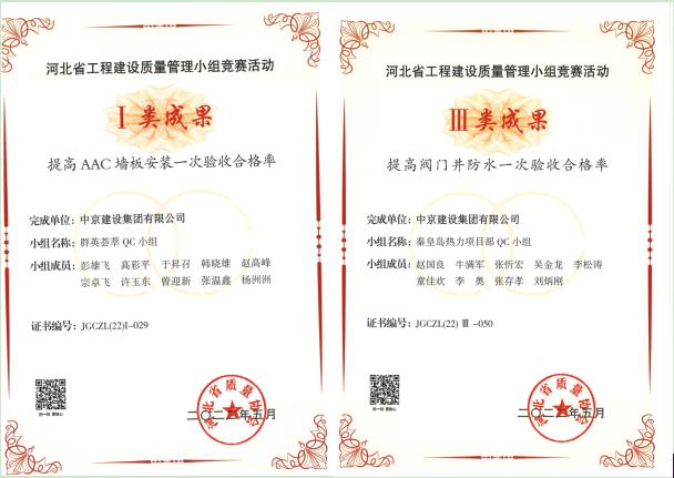 榮獲2022年度河北省工程建設(shè)質(zhì)量QC成果一等獎和三等獎