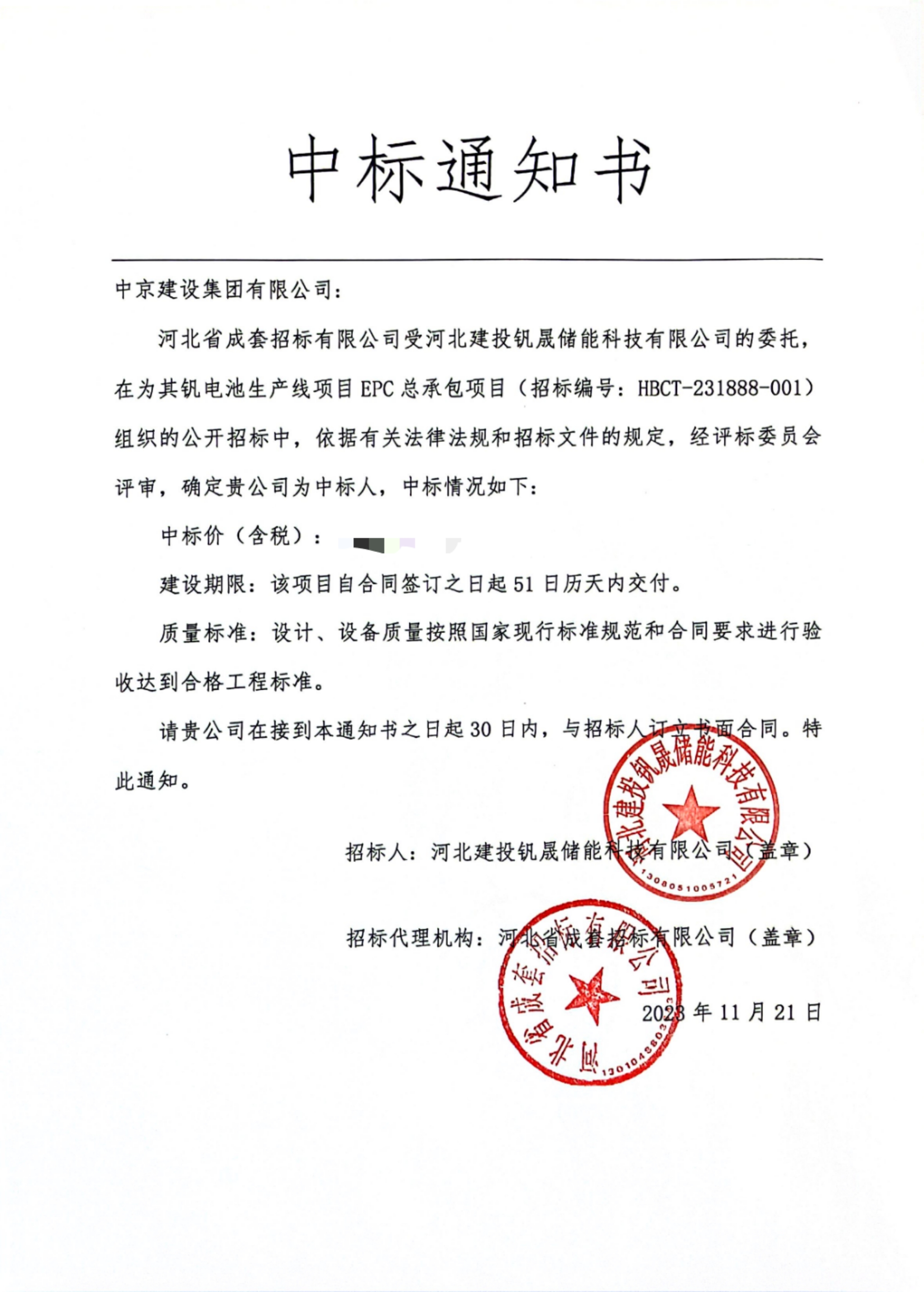 2023-12-01近日,河北建投釩晟儲(chǔ)能科技有限公司釩電池生產(chǎn)線(xiàn)EPC總承包項(xiàng)目公開(kāi)招標(biāo),經(jīng)過(guò)激烈的角逐,最終中京建設(shè)集團(tuán)(以下簡(jiǎn)稱(chēng):中京集團(tuán))成功中標(biāo)。中京集團(tuán)依托“設(shè)計(jì)+施工”方面的技術(shù)優(yōu)勢(shì)和實(shí)踐經(jīng)驗(yàn),助力河北建投釩晟儲(chǔ)能科技有限公司構(gòu)建高智能化的釩電池生產(chǎn)體系,此次中標(biāo)彰顯了中京集團(tuán)在工程建設(shè)領(lǐng)域的技術(shù)實(shí)力和領(lǐng)先優(yōu)勢(shì)。