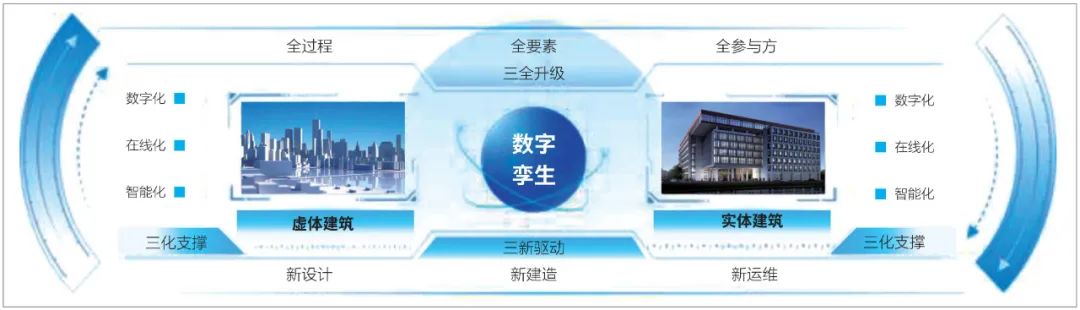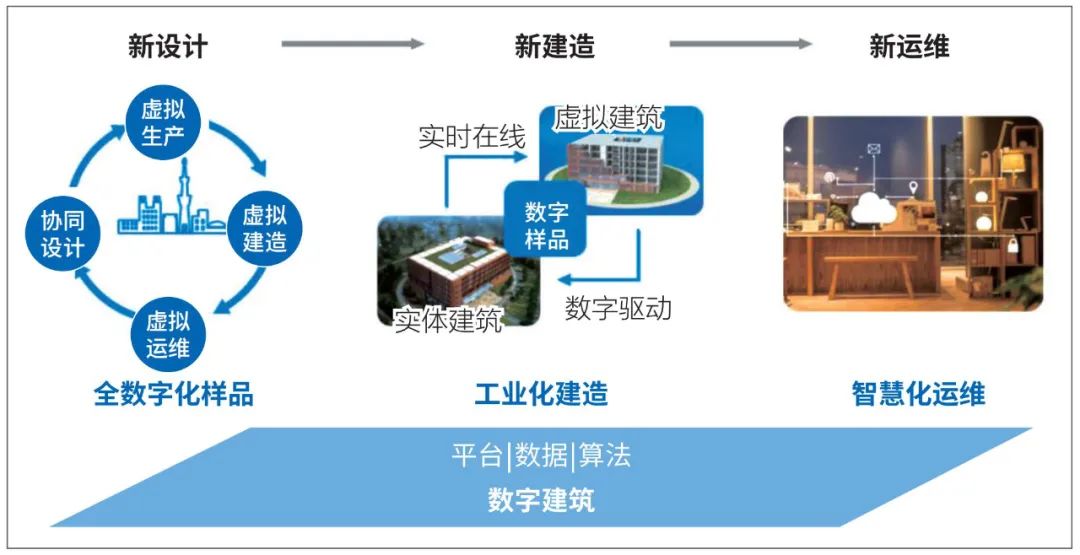 在數(shù)字建筑推動建筑產(chǎn)業(yè)數(shù)字化轉(zhuǎn)型的過程中,新設(shè)計、新建造、新運維是核心,擔(dān)負(fù)著賦能整個產(chǎn)業(yè)的轉(zhuǎn)型升級的重任。其中,新設(shè)計是指數(shù)據(jù)驅(qū)動的高標(biāo)準(zhǔn)精細(xì)設(shè)計,以虛映實,通過平臺進(jìn)行協(xié)同設(shè)計打造一體化全數(shù)字樣品;新建造是指數(shù)字孿生的工業(yè)建造,以虛控實,融合工廠生產(chǎn)和現(xiàn)場施工的一體化“數(shù)字生產(chǎn)線”,實現(xiàn)數(shù)字孿生建造;新運維是指虛實融合的智能運維,以實映虛,通過數(shù)字虛體建筑實現(xiàn)智慧化運維。