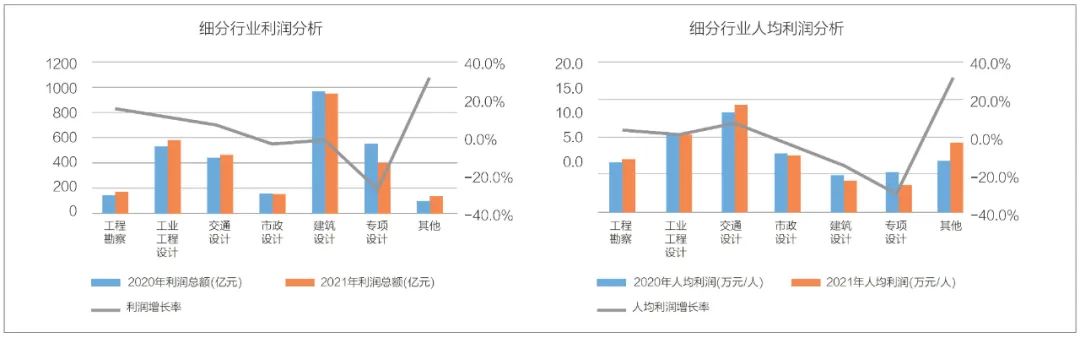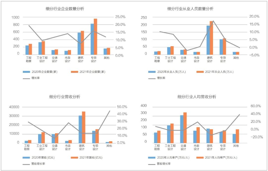 設(shè)計師的價值創(chuàng)造能力與其創(chuàng)造的營收成正比?!豆こ炭辈煸O(shè)計行業(yè)年度發(fā)展研究報告(2022)》中數(shù)據(jù)顯示,建筑設(shè)計及專項設(shè)計類企業(yè)和從業(yè)人員數(shù)量最多、營收規(guī)模最大,但人均產(chǎn)值較低,處在中下游水平,而且建筑設(shè)計類人均單產(chǎn)出現(xiàn)負(fù)增長。