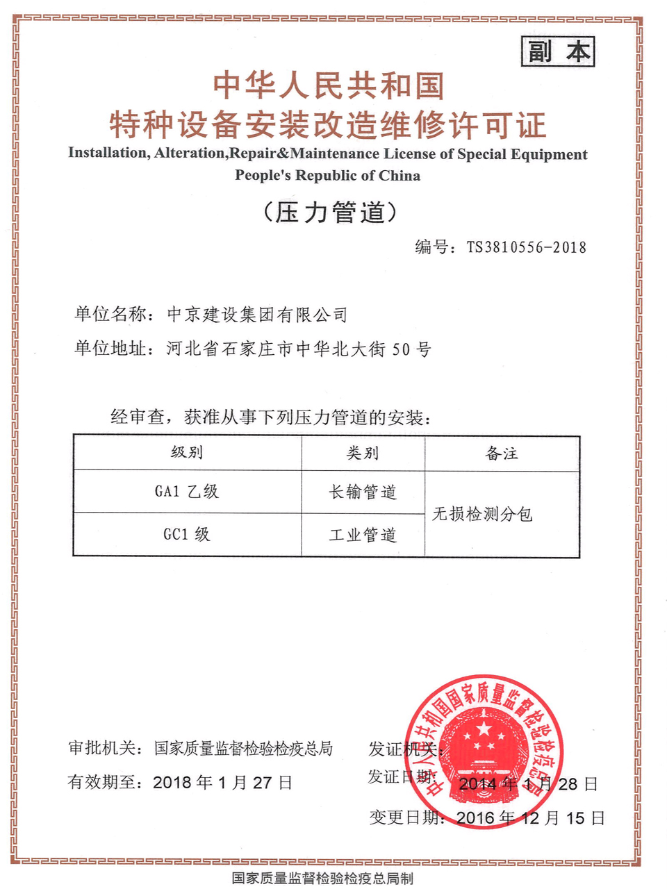 2016年09月28-29日北京石化建壓力管道安裝評審中心的專家到試安裝項(xiàng)目現(xiàn)場進(jìn)行審查,2016年10月29-30日,評審中心的四位專家到中京集團(tuán)對公司的資源條件、質(zhì)量保證體系、安裝質(zhì)量等方面進(jìn)行了全面評審,石家莊市質(zhì)量技術(shù)監(jiān)督局的領(lǐng)導(dǎo)對評審過程進(jìn)行了監(jiān)督。我公司各部門積極配合,評審專家們嚴(yán)肅認(rèn)真、一絲不茍,經(jīng)過2天緊張的審查,確認(rèn)中京集團(tuán)資源條件符合要求、質(zhì)量保證體系運(yùn)行正常、安裝工程質(zhì)量合格、相關(guān)技術(shù)資料審查合格,各方面工作管控到位,受到幾位專家的一致贊揚(yáng),順利通過評審;整個評審過程公開、公平、公正。集團(tuán)公司于2016年 12月15日領(lǐng)取了GA1乙級壓力管道安裝許可。