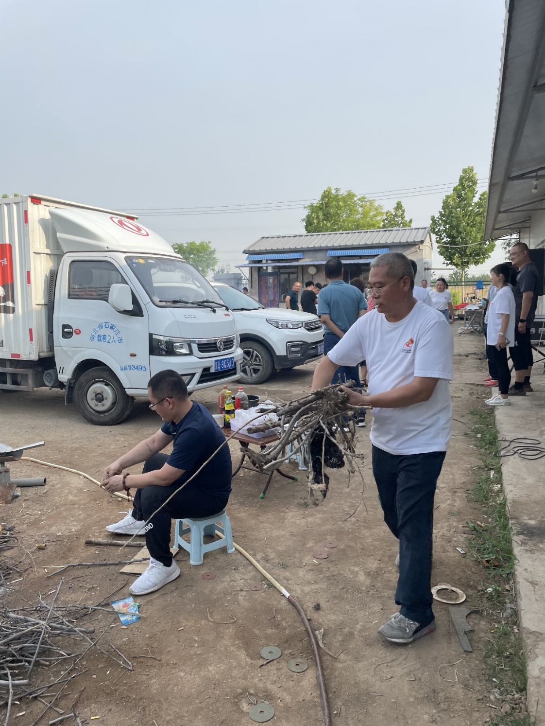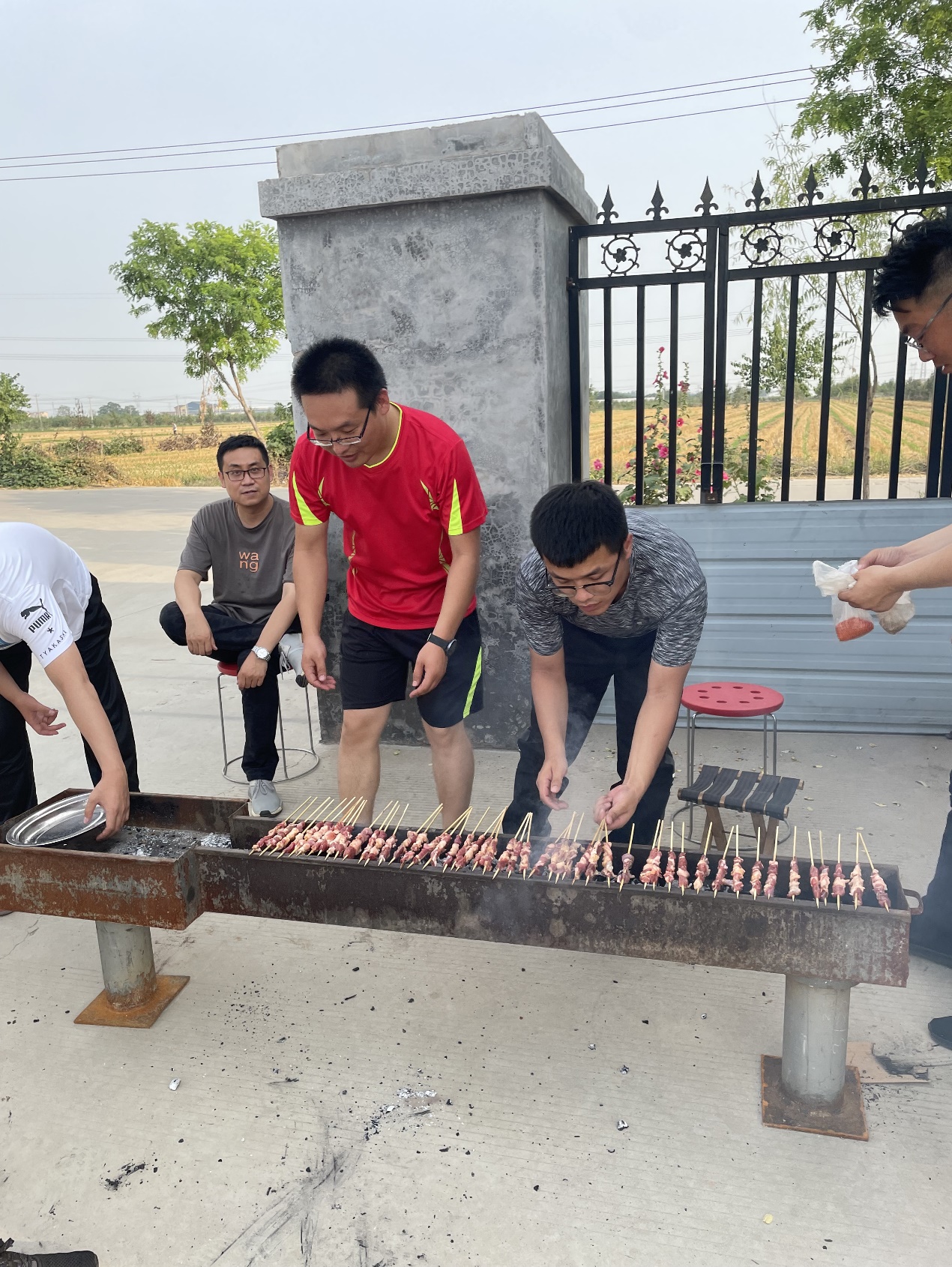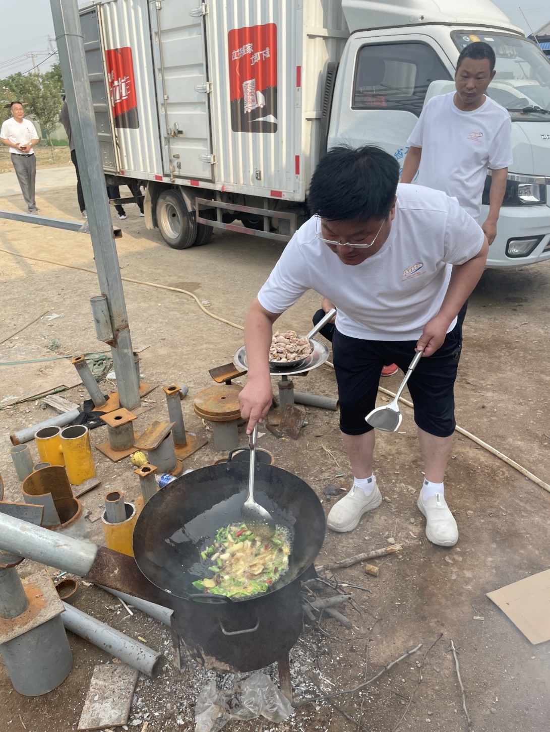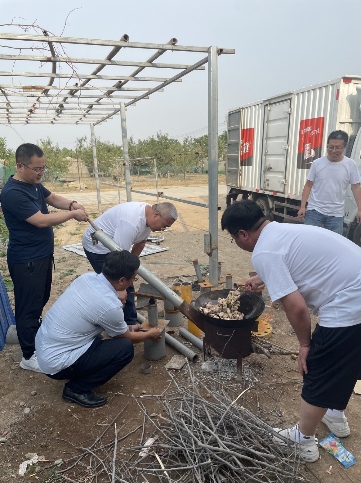 燒烤活動開始了,大家分工明確,洗菜、裝盤、生火、烤肉串,公司黨支部書記岳陸堂帶領大家鋼管壘灶,劈柴燒火;總經理劉偉親自掌勺秀廚藝,給大家燉了一大鍋鮮香美味的野山雞燉蘑茹,歡聲笑語,不亦樂乎!